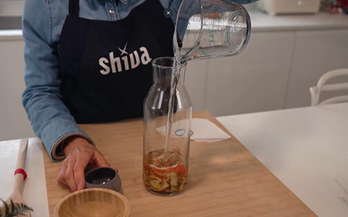 1. Remplissez les trois quarts de votre bocal en verre avec les pelures et les trognons de pommes.